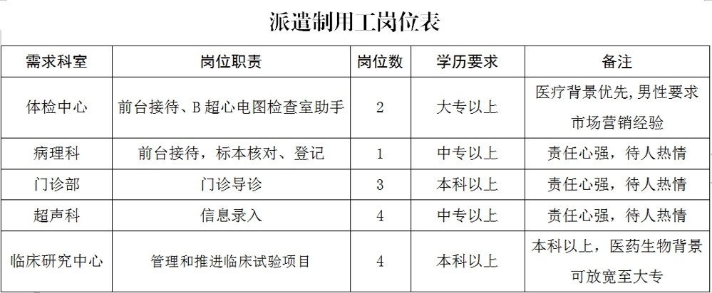 因我院業(yè)務(wù)上升,人員需求增加,現(xiàn)急需招聘體檢中心、門診部、醫(yī)療輔助科室及臨床研究項(xiàng)目派遣制用工14名(具體見附件“派遣制用工崗位表”,以下簡(jiǎn)稱“崗位表”),條件要求如下: