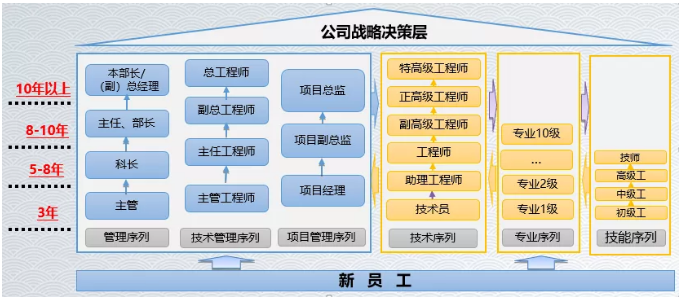 公司設(shè)計“管理、技術(shù)、專業(yè)、技能”四大職業(yè)發(fā)展通道及輪換路徑,以可視化方法實現(xiàn)崗位職責、學習要求、能力及績效要求、福利待遇等的顯現(xiàn)化,打造內(nèi)、外職業(yè)生涯相互提升的可視化職業(yè)生涯發(fā)展體系,為員工向上發(fā)展提供“牽引力”;級別調(diào)整帶動薪酬的調(diào)整。
